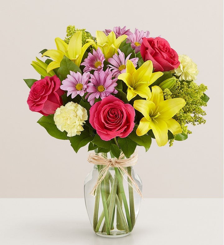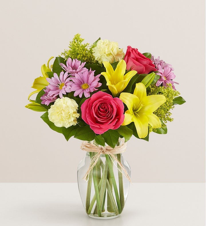 A vibrant mix of blooms inside a glass vase tied with raffia, it’s a gift that delights with Old World charm and style.