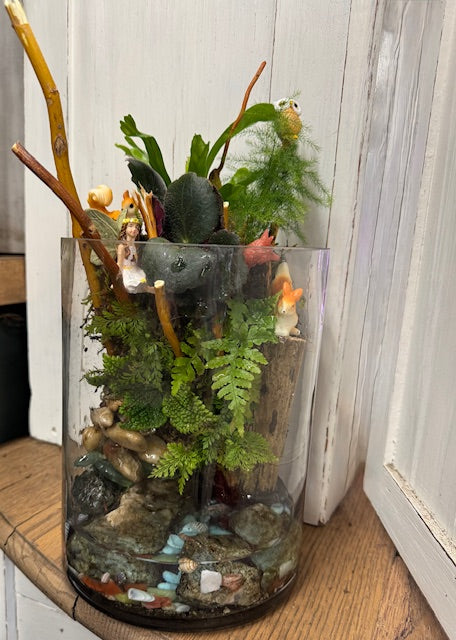 Hidden Hollow Fairy Forest Description: Tucked inside a tall glass vessel, this enchanting fairy garden feels like a secret woodland hideaway. Lush green ferns, moss, and natural branches rise upward, creating the feeling of a miniature forest in layers. Tiny fairies peek out from the foliage, as if quietly watching from their hidden hollow, while smooth stones and crystal accents line the forest floor below. The vertical design draws the eye upward, giving this garden a magical, storybook depth—like stumbling upon a fairy dwelling deep in the woods. A whimsical and serene piece, perfect for bringing a touch of forest magic and imagination into any space.