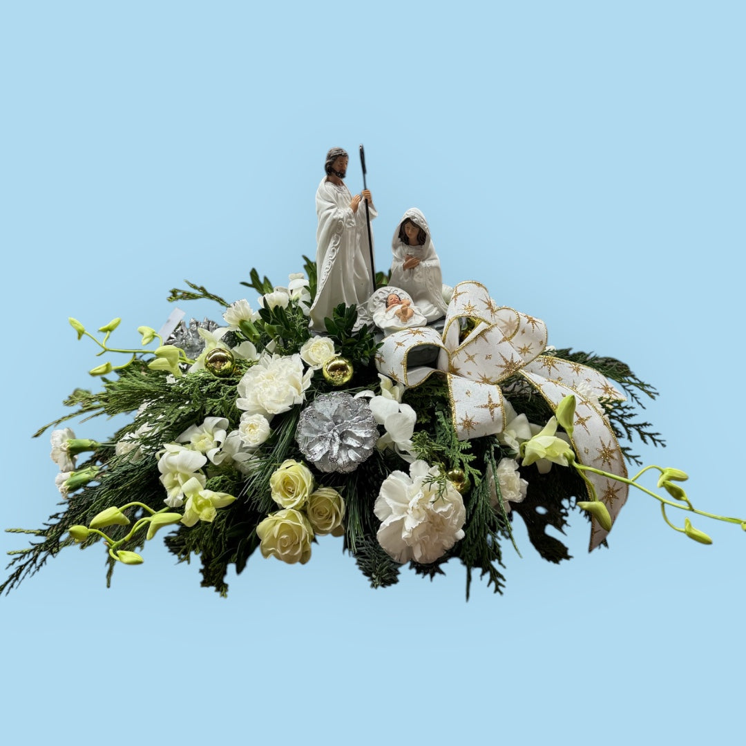 A beautiful nativity scene with white and gold accents is a perfect addition to the Christmas dinner table.